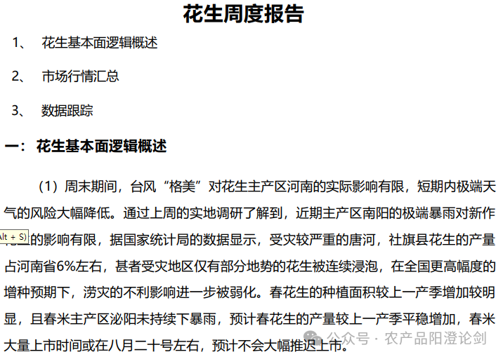 周末期间,台风“格美”对花生主产区河南的实际影响有限,短期内极端天气的风险大幅降低。通过上周的实地调研了解到,近期主产区南阳的极端暴雨对新作花生的影响有限,据国家统计局的数据显示,受灾较严重的唐河,社旗县花生的产量占河南省6%左右,甚者受灾地区仅有部分地势的花生被连续浸泡,在全国更高幅度的增种预期下,涝灾的不利影响进一步被弱化。