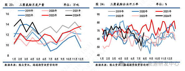 今年工业方面需求增量较大,增量的主要贡献是电厂脱硫脱硝,尿素替代液氨的改造升级仍在逐步进行中,政策要求2024年底之前电力行业液氨重大危险源全部完成改造,因此预计今年下半年,电厂脱硫脱硝对尿素需求稳步提升。尽管国内房地产行业较为疲软,但由于国内三聚氰胺价格优势,三聚氰胺出口带动三聚氰胺企业开工率维持在高位,截至7月29日,全国三聚氰胺企业的开工率回升至67.23%,处于历史同期中高位。从产量来看,上半年三聚氰胺累计产量为81.26万吨,累计同比大幅增加25.91%;上半年三聚氰胺累计出口量为31.67万吨,占总产量的近40%。从目前的情况来看,国内需求短期对三聚氰胺产量支撑较为有限,但出口订单对三聚氰胺产量仍有一定支撑,预计短期内三聚氰胺产量维持高位。