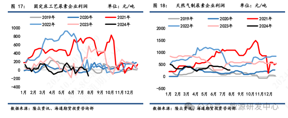 7月份虽然处于煤炭的需求旺季,但由于前两年保供以及今年进口煤增量较大的影响,煤炭社会库存并不低,导致煤炭价格在旺季未出现大幅波动。截至7月29日,秦皇岛港动力煤平仓价格为854元/吨,月环比上涨9元/吨;晋城无烟煤价格为915元/吨,月环比下跌40元/吨。原料煤价格波动不大,但尿素价格7月份持续下跌,导致尿素企业利润不断收缩。从不同的工艺来看,7月份固定床工艺成本虽然小幅回调至2244元/吨左右,但企业因尿素价格下跌开始出现亏损;水煤浆气化成本小幅回调至1764元/吨,利润收缩至300元/吨左右。8月份尿素下游需求仍然较弱,预计尿素价格有持续下跌的趋势。
