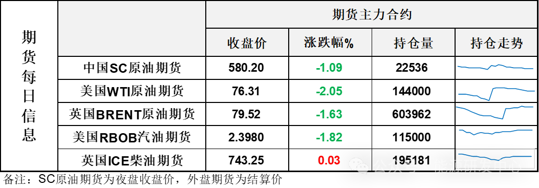 【1】WTI主力原油期货收跌1.6美元,跌幅2.05%,报76.31美元/桶;布伦特主力原油期货收跌1.32美元,跌幅1.63%,报79.52美元/桶;INE原油期货收跌1.09%,报580.2元。