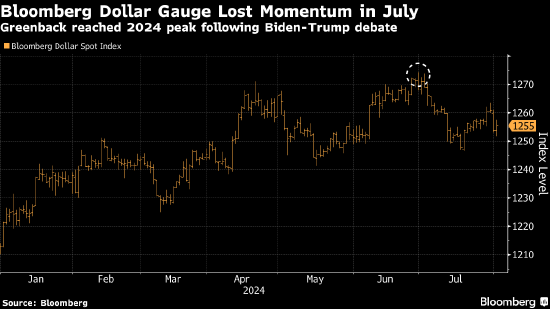 自美国总统乔·拜登宣布他不会寻求第二个任期、民主党人团结一致支持副总统哈里斯成为候选人以来的11天里,被视为将受益于唐纳德·特朗普获胜的交易策略已经失去势头。美元停滞不前,美国国债上涨,比特币下跌。